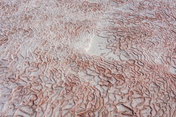 Хотя в самом регионе находится 17 источников с термальной водой температурой от 35 до 100 °C, белые травертины в Памуккале формируются осаждением кальция из воды одного источника с расходом воды в 466,21 литров в секунду, температурой 35,6 °C. Вода по регулируемому руслу вытекает на склон и спускается по склону с высоты 60-70 метров, постепенно осаждая карбонат кальция в виде мягкого геля в ходе химической реакции. Для формирования твердой породы необходимо не осуществлять перемешивание геля. Поэтому доступ на некоторые части горы для посетителей закрыт[5].