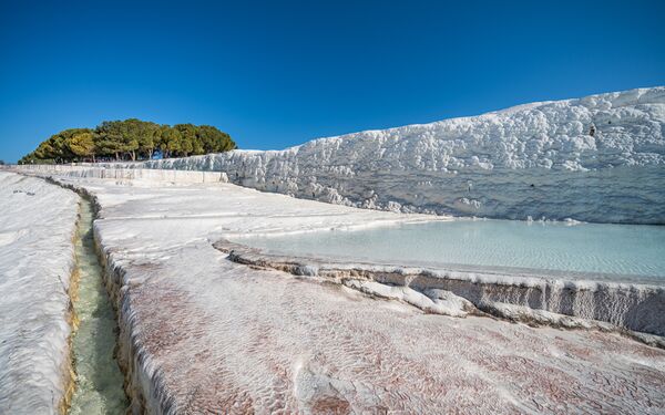 В том месте, где насыщенные кальцием термальные воды выходят на поверхность высокого холма высотой почти 200 м, сформировался удивительный ландшафт Памуккале (что означает «хлопковая крепость»), предстающий в виде целого каскада террасных ванн, украшенных белоснежными кальцитовыми сталактитами. В конце II в. до н. э. династия Атталидов, правителей Пергамского царства, основала курорт Иераполис. Здесь можно увидеть руины древних бань, храмов и других эллинистических памятников[1].