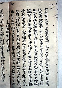 В 712 году было закончено первое из полностью дошедших до наших дней древнеяпонских сочинений — «Кодзики» («Записи о делах древности»). Свод, состоящий из трёх свитков, представляет собой сборник текстов, сложившихся в устной традиции, и несёт на себе отпечаток дописьменной культуры Японии. Фактически, это собранные воедино мифы, легенды и сказания различных могущественных родов, а также исторические хроники и генеалогия правителей (в том числе легендарных), прошедшие цензуру императорского двора и записанные составителем О-но Ясумаро на вэньяне. «Кодзики» обосновал и утвердил легитимность правящей династии как прямых потомков Аматэрасу и высокое положение в обществе других японских родов, приближённых ко двору[210].