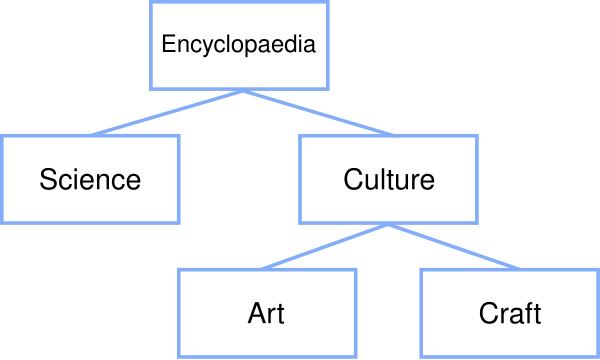 В приведенном выше примере, «энциклопедия» является родителем по отношению к «науке» и «культуре», которые соответственно, являются её «детьми». «Искусство» и «ремесло» являются братьями по отношению друг к другу и детьми по отношению к «культуре».