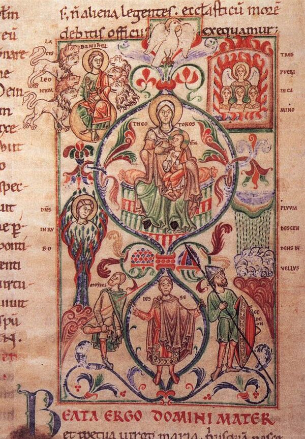 Первоначально родословие Иисуса Христа появилось в книжной миниатюре в иллюминированных кодексах. Так, например, миниатюра данного вида есть в Золотом кодексе из Лорша, евангельском сборнике[4] времён Каролингского возрождения. Композиция иллюстрирует текст Евангелия от Матфея, где приводится родословие Христа (Мф.1:1-16). Миниатюра «Древо Иессеево» есть в Библии чешского короля Вратислава. Здесь композиция ещё не разработана и Иессей изображён с маленьким деревцем, на ветвях которого сидят семь голубков в крестчатых нимбах. Семь голубей символизируют семь даров Святого Духа. Их же мы встречаем на миниатюре из Евангелия аббатства Гросс-Санкт-Мартин из Кёльна. Здесь они изображены на семи медальонах, окружающих нимб Иисуса Христа.