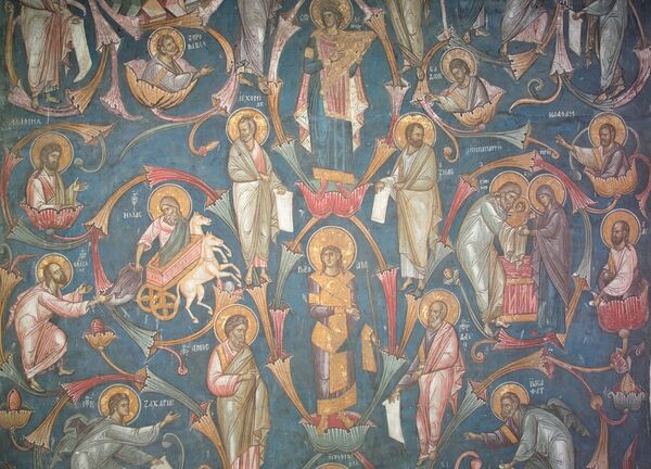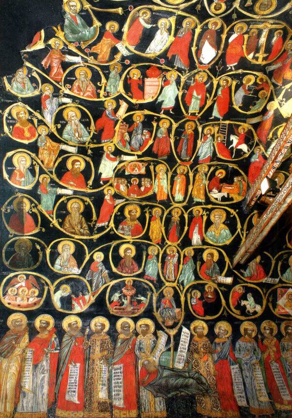 Праведный Иессей спит. Из-под плеча его выходят три ствола с ветвями; из них два малые обвились около него, а третий, великий, растет вверх, и на нем в ветвистых кругах видны еврейские цари от Давида до Христа: — первый — Давид с арфою; выше его Соломон с книгою закрытою, выше Соломона прочие цари, по порядку, со скиптрами в руках; а на вершине ветвистого ствола — рождество Христово, и по обе стороны его, в ветвях, пророки с пророчествами взирают и указывают на Христа.