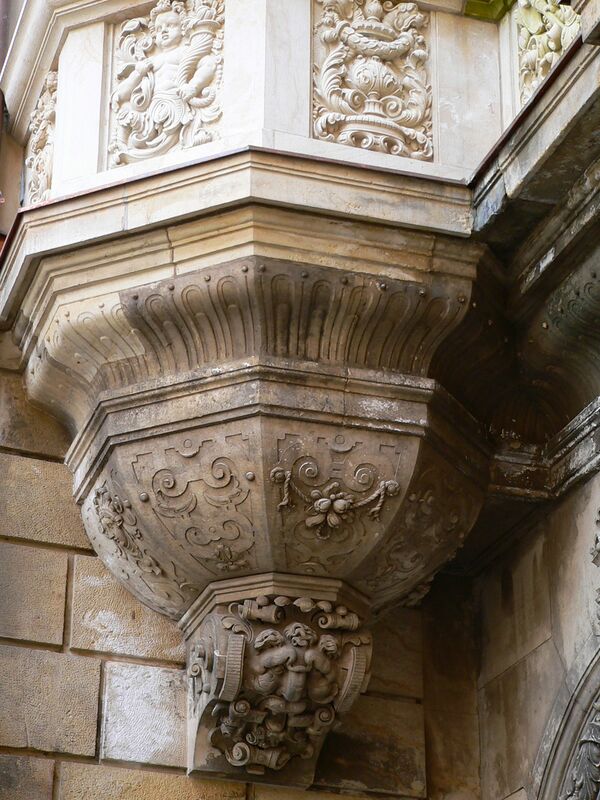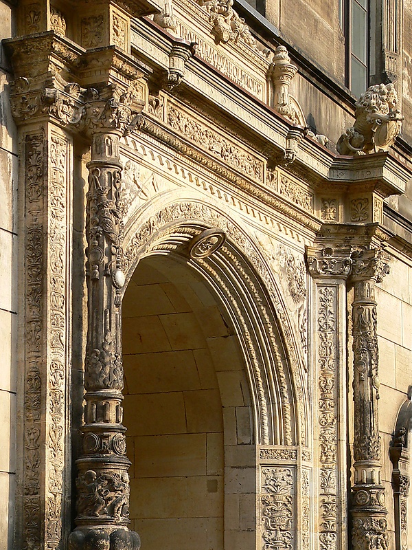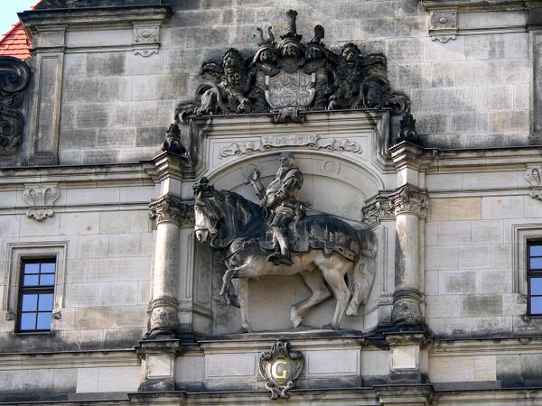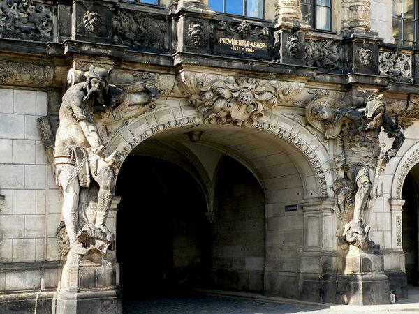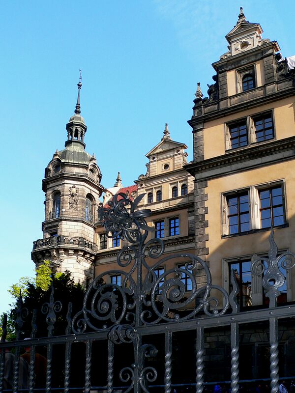 денег и ценных документов курфюрста. Во внутреннем дворе замка, который увеличился почти вдвое, и по планам Морица должен был служить для проведения рыцарских турниров, по образцу французского замка Шамбор (фр. château de Chambord) были построены три угловые башни. Стены были украшены картинами в стиле сграффито (итал. sgraffito). «Сторожевая башня», бывшая до перестройки угловой, находилась теперь в середине северного флигеля замка. Часть флигеля восточнее башни, которой не коснулась реконструкция, с этого времени стала называться Altes Haus (старый дом), во вновь выстроенной части, западнее башни, была оборудована придворная капелла, в 1558 году вход из двора в капеллу был украшен золотыми воротами. В 1590—1594 годах с южной стороны был достроено ещё одно здание, таким образом, замок получил ещё один внутренний двор. Следующая большая волна перестроек замка приходится на конец XVII — начало XVIII века. В 1674—1676 годах «Сторожевая башня» получила барочную крышу со шпилем, общая высота башни стала теперь 101 метр, до 1945 года башня была самым высоким строением в Дрездене. С 1693 года замок, имевший лишь одни ворота, расположенные с юга, получает ещё одни, «Зелёные ворота» с севера, расположенные точно под сторожевой башней. Во время правления Августа Сильного в 1701 году в замке произошёл большой пожар, в результате которого сгорают восточный флигель и Георгиевские ворота. Несмотря на то, что большая часть построек в Дрездене возводилась в это время в стиле барокко, реставрация замка проводилась без изменения архитектурного стиля.