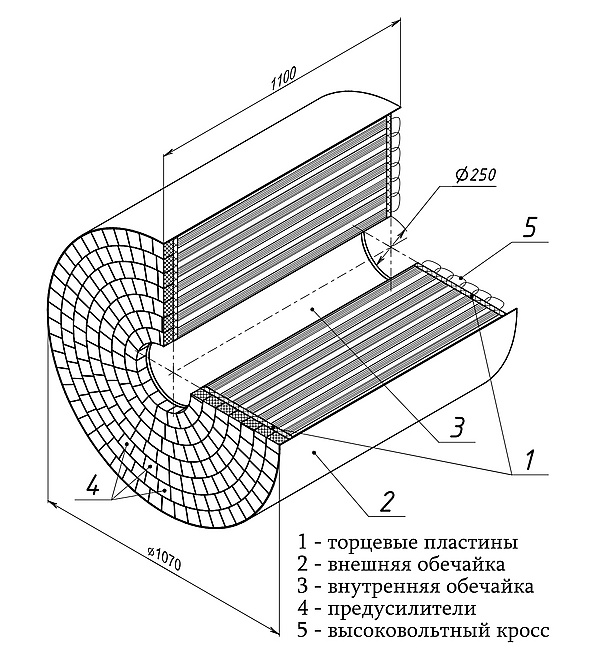 На рисунках 1 и 2 представлены внешний вид цилиндрической дрейфовой камеры (многопроволочной пропорциональной камеры) и схема её устройства.