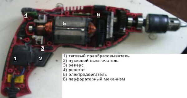 При приведении дрели в рабочее состояние патрон вращается, приводя тем самым насадку в механическое движение. Скорость вращения (число оборотов в единицу времени) можно регулировать при помощи реостата, направление вращения — при помощи реверса.