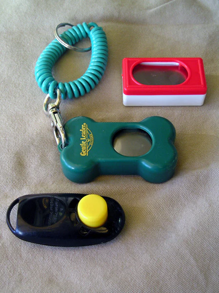 Дрессировка с использованием кликера помогает отработать точность исполнения трюков и базовых команд. Кликер — это пластиковое или металлическое устройство, которое издает щелчок при нажатии[29]. Момент, когда издаётся звук, служит сигналом для собаки о том, что она выполнила команду правильно[30]. То есть щелчок служит для животного сигналом о том, что оно получило награду. Перед началом дрессировки необходимо обучить собаку воспринимать и реагировать на щелчок. С помощью кликера хозяин может подкрепить нужное поведение собаки, тем самым обучить питомца новым командам. Кликер позволяет зафиксировать правильно выполненную команду гораздо чётче, чем хозяин делает это вербально[31][32].