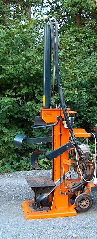 - вертикальные. Бревно устанавливается вертикально, сверху на него толкается нож (при помощи гидроцилиндра). КПД данных станков выше, нежели у горизонтальных, поскольку бревно во время раскола не движется и не создаёт дополнительного трения. Однако при работе с криво отпиленными чурбаками (как это часто происходит в России) приходится удерживать их вручную, что ведёт к нарушениям техники безопасности.