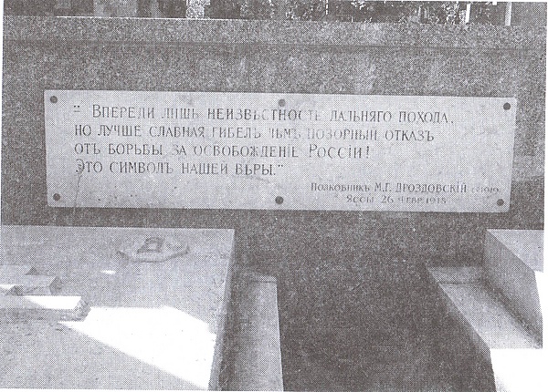 Когда Добровольческая армия отступила из Екатеринодара в марте 1920 года, специальный отряд дроздовцев, зная, как обращаются красные с могилами белых вождей, ворвался в оставленный ВСЮР Екатеринодар и вывез из уже захваченного красными города останки Генерального штаба генерал-майора М. Г. Дроздовского и полковника Туцевича, чтобы не оставлять их красным на поругание. Останки были погружены на транспорт в Новороссийске, перевезены в Крым. В Севастополе, учитывая отсутствие уверенности в том, что Белый Крым устоит, оба гроба были вторично погребены на Малаховом кургане, но, в связи с непрочностью положения, под чужими фамилиями на крестах[110][111].