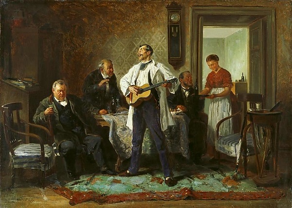 На картине изображён интерьер жилой комнаты с обоями, в глубине которой размещены часы в тёмно-коричневом футляре. На полу лежит сбившийся светло-зелёный ковёр с кирпичной каймой. В центре комнаты стоит стол, покрытый голубой узорной скатертью, на котором находятся графин, рюмки и грязная посуда. Вокруг стола расположились пять персонажей: двое сидят, один привстал с поднятой рукой, а в центре изображён мужчина в синих брюках и белом кителе, держащий в руках гитару и поющий. Справа в дверном проёме, ведущем на кухню, стоит молодая женщина в красном платье и белом фартуке, подающая на стол. По обе стороны стола размещены кресла с полосатой голубой обивкой, у правого кресла — этажерка с книгами. Композиция картины подчёркивает атмосферу домашнего уюта и повседневной жизни, характерную для бытового жанра.