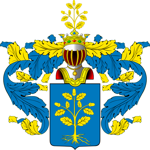 Щит увенчан дворянскими шлемом и короной. Нашлемник: дуб с желудями. Намёт на щите голубой, подложенный золотом.
