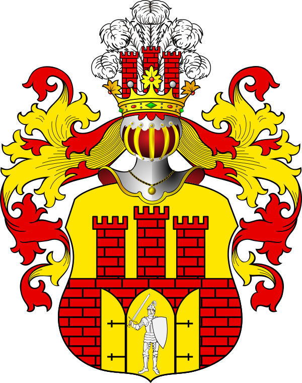 В щите, имеющем золотое поле, находится крепость о трёх башнях натурального цвета и в воротах стоит воин, держащий в правой руке меч, а в левой щит (польский герб Гржимала).