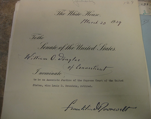 В 1936 году президент Франклин Делано Рузвельт назначил его членом Комиссии по ценным бумагам и биржам[8], а в 1937 году Дуглас возглавил Комиссию. Вскоре он попал на обложку журнала Time[9]. После ухода в отставку члена Верховного суда США Луи Брэндайса, предложившего на своё место Дугласа, Рузвельт выдвинул его на освободившуюся должность в марте 1939 года, и вскоре кандидатура Уильяма О. Дугласа была утверждена Сенатом[4][6][7].