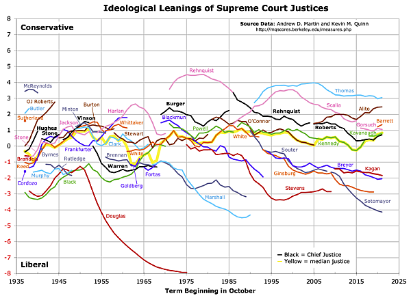 После отставки Уильяма О. Дугласа журнал Time назвал его «наиболее доктринёрским и преданным гражданским свободам» судьёй за всю историю Верховного суда и отметил, что его решения защищали свободу слова и конституционные права личности[13]. Дугласа оценили как наиболее либерального из всех членов Верховного суда с 1937 года по шкале Мартина-Куинна[14]. Отмечали его сильную приверженность свободе слова, правам личности, а также праву государства регулировать экономику[11].