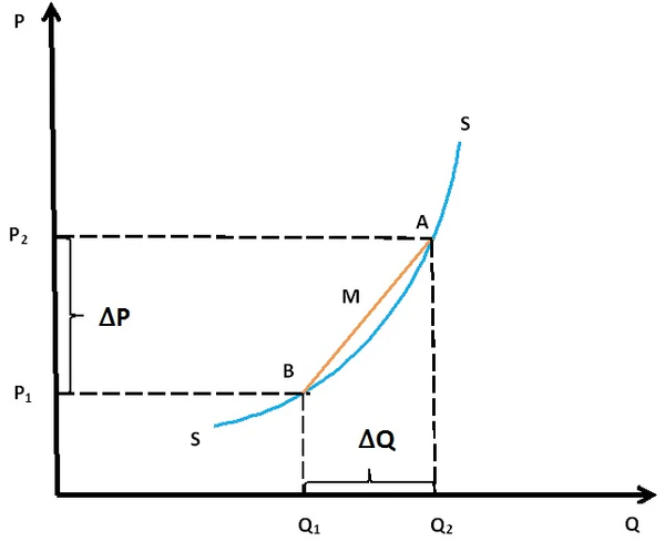 где - это предложение, - исходное количество произведенного товара, - новый объём предложения, - исходная цена товара, - новая цена товара, , - изменение предложения и цены.