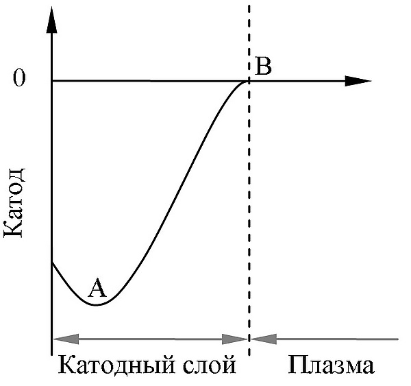 В слое, покрывающем электрод, возникает сильное электрическое поле, вызванное действием нескомпенсированных объемных зарядов, которые экранируют возмущение, вносимое в плазму электродом. Это возмущение не простирается дальше толщины слоя катодного слоя Распределение потенциала φ и поля E в слое рассчитывается по уравнению Пуассона:
