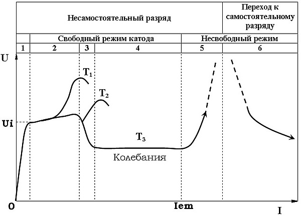 Если постепенно понижать температуру T катода и тем самым уменьшать ток эмиссии, сохраняя неизменным давление газа, то область 4 будет уменьшаться и перемещаться по характеристике вверх (на рисунке ).