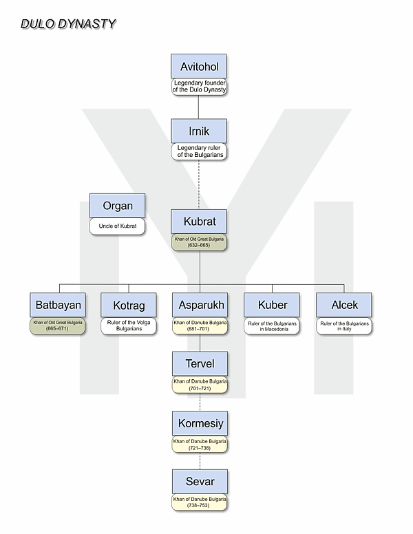 Известны болгарские правители из рода Дуло — Кубрат (основатель Великой Болгарии), несколько легендарных его сыновей, из которых прослеживаются по источникам Батбаян (по именнику Безмер) и Аспарух (основатель Дунайской Болгарии), и правители Дунайской Болгарии Тервел, Кормесий и Севар.