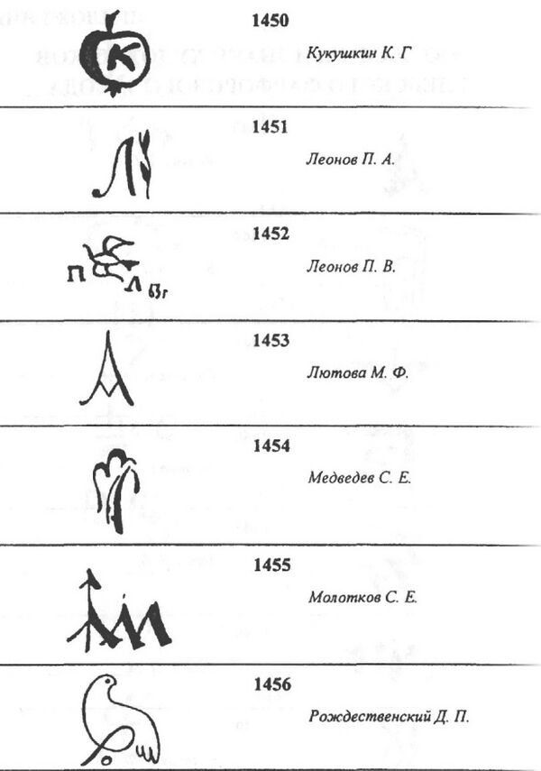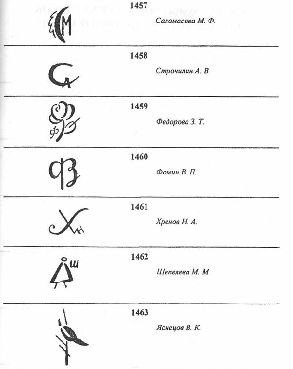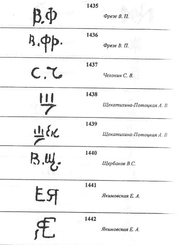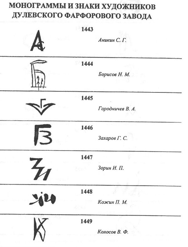 Ниже представлены монограммы и знаки художников завода.