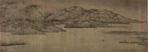 Свиток «Реки Сяо и Сян» (50х141,4 см.) композиционно принадлежит к тому же разряду, что и два предыдущих. На переднем плане художник изобразил речной простор, видны рыбацкие лодки, а на дальнем берегу рыбаки вытаскивают сеть. Среди китайских учёных-чиновников изображение места слияния рек Сяо и Сян было одной из излюбленных тем. Согласно легенде, в этом месте утопились жёны мифического императора Шуня после его смерти, превратившись позже в речные божества (подобная же легенда существует и о дочерях мифического императора Яо). Но скорее всего художников привлекала красота местного пейзажа. Его часто изображали художники эпохи Мин и Цин; на этом свитке стоит печать одного из выдающихся минских художников и теоретиков Дун Цичана (1555—1635); это означает, что свиток когда-то был в его коллекции.