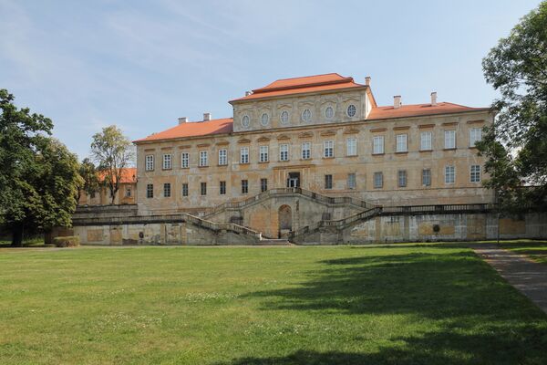 Возник в XIII веке как укрепление феодалов Грабишичей. В XVI веке Лобковицы на месте замка выстроили ренессансный дворец, который в середине XVII века перешёл по наследству к Вальдштейнам. Для перестройки резиденции в стиле барокко был приглашён Жан Батист Матеи[3], уже построивший Тройский замок под Прагой. Он не только возвёл новый господский дом, но и спроектировал хозяйственные пристойки, больничный корпус и регулярный парк. Над украшением резиденции Вальдштейнов в XVIII веке работали такие видные мастера, как Матиаш Бернард Браун и Венцель Лоренц Райнер[3].
