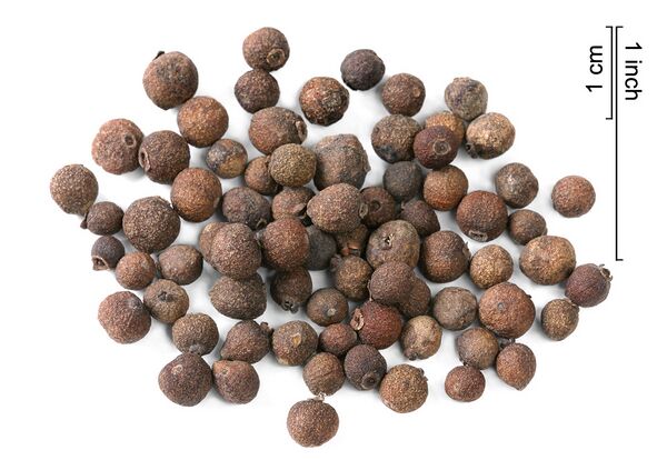Эти плоды представляют собой ягоды: сначала сине-зелёного цвета, после сушки — шероховатые бурые горошины в два-три раза крупнее, чем у перца чёрного, содержащие до 4 % эфирного масла. Душистый перец имеет пряный запах, жгучий вкус и напоминает смесь чёрного перца, гвоздики, мускатного ореха и корицы.