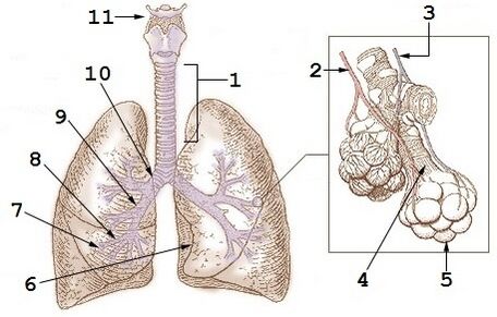 Функция внешнего дыхания обеспечивается как дыхательной системой, так и системой кровообращения. Атмосферный воздух попадает в лёгкие из носоглотки (где предварительно очищается от механических примесей, увлажняется и согревается) через гортань и трахеобронхиальное дерево (трахею, главные бронхи, долевые бронхи, сегментарные бронхи, дольковые бронхи, бронхиолы и альвеолярные ходы) попадает в лёгочные альвеолы. Дыхательные бронхиолы, альвеолярные ходы и альвеолярные мешочки с альвеолами составляют единое альвеолярное дерево, а вышеуказанные структуры, отходящие от одной конечной бронхиолы, образуют функционально-анатомическую единицу дыхательной паренхимы лёгкого — а́цинус (лат. ácinus — гроздь). Смена воздуха обеспечивается дыхательной мускулатурой, осуществляющей вдох (набор воздуха в лёгкие) и выдох (удаление воздуха из лёгких). Через мембрану альвеол осуществляется газообмен между атмосферным воздухом и циркулирующей кровью[5]. Далее кровь, обогащённая кислородом, возвращается в сердце, откуда по артериям разносится ко всем органам и тканям организма. По мере удаления от сердца и деления, калибр артерий постепенно уменьшается до артериол и капилляров, через мембрану которых происходит газообмен с тканями и органами. .