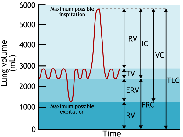 После максимального выдоха в лёгких остаётся воздух в количестве около 1500 мл, называемый остаточным объёмом лёгких. После спокойного выдоха в лёгких остаётся примерно 3000 мл. Этот объём воздуха называется функциональной остаточной ёмкостью (ФОЁ) лёгких.