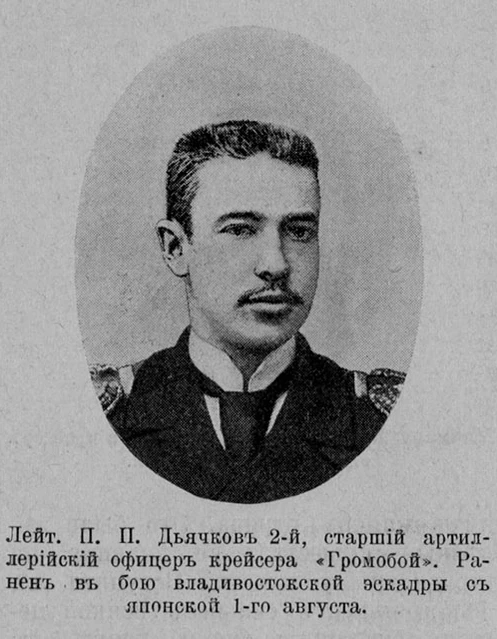 Павел Павлович Дьячков 2-й родился 12 июня 1876 года. В 1887 году поступил в Морской кадетский корпус. В службе с 1890 года. В 1896 году после окончания учёбы произведён в мичманы. В 1897—1899 годах младший штурманский офицер П. П. Дьячков находился в заграничных плаваниях на крейсере 1 ранга «Герцог Эдингбурский», который входил в состав Учебно-артиллерийского отряда Балтийского флота. В 1900 году переведён артиллерийским офицером на крейсер «Громобой», на котором перешёл на Дальний Восток и вошёл в состав Первой Тихоокеанской эскадры. 1 апреля 1901 года произведён в лейтенанты. В 1903 году после окончания Артиллерийского офицерского класса зачислен в старшие артиллерийские офицеры 1 разряда[1].