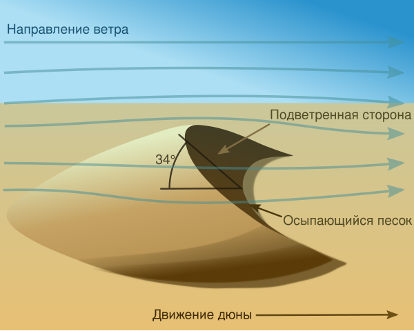 Особенностью дюн является их способность к движению за счёт переноса ветром песка через гребень; при постоянных сильных ветрах и происходит движение. Скорость движения дюн может составлять до 20 метров в год. В приморских районах дюны, как правило, движутся вглубь суши.