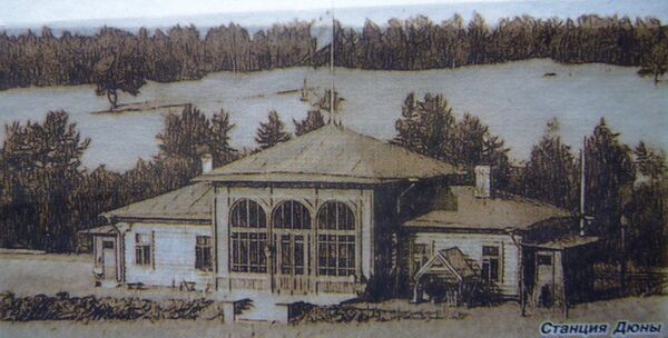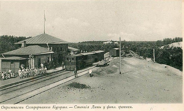 В мае 1900 года разрешение на строительство железной дороги от начальника Санкт-Петербургского таможенного округа было получено, и уже к лету 1900 года через Заводскую Сестру около Курорта был сооружён железнодорожный мост. Строительство замедлилось из-за большого объёма земляных работ по преодолению крутых песчаных дюн, строительства моста для гужевого транспорта и таможенного здания. Планировалось открыть на границе и почтовое отделение. 17 августа 1902 года началось рабочее движение поездов по новой ветке. Состав из паровоза и двух-трёх вагонов, отправлявшийся со станции Курорт, за 10 минут успевал проехать платформу Школьную и, миновав песчаную дюну, прибывал на конечный пункт — Дюны. Деревянное одноэтажное здание станции включало в себя зал ожидания и небольшие пристройки для служебного персонала. Высокий павильон зала ожидания был хорошо освещён, благодаря занимавшему всю стену панорамному окну. Путь от платформы до таможенного пункта и пограничного моста шёл вниз по косогору, расстояние составляло около 300 метров.