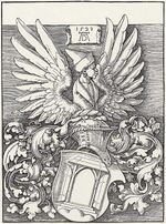 В первые годы XVI века художник занялся изготовлением печатных книжных знаков, всего известно 20 экслибрисов авторства Дюрера, из них — 7 в проекте и 13 готовых. Первый экслибрис Дюрер делал для своего друга, литератора и библиофила Виллибальда Пиркгеймера, работа не была завершена, эскиз в настоящее время хранится в библиотеке Варшавского университета. Знаменитым стал второй (тиражированный) экслибрис Пиркгеймера — геральдический знак с девизом в центральном поле «Себе и друзьям» (девиз, который впоследствии использовали многие библиофилы). Собственный экслибрис с гербом Дюреров художник выполнил в 1523 году[72]. Изображение открытой двери на щите указывает на фамилию «Дюрер». Орлиные крылья и чёрная кожа мужчины — символы, часто встречающиеся в южнонемецкой геральдике; они использовались также нюрнбергской семьёй матери Дюрера, Барбары Хольпер. Дюрер был первым художником, который создал и использовал свой герб и знаменитую монограмму (большая буква A и вписанная в неё D), впоследствии у него появилось в этом множество подражателей[73].