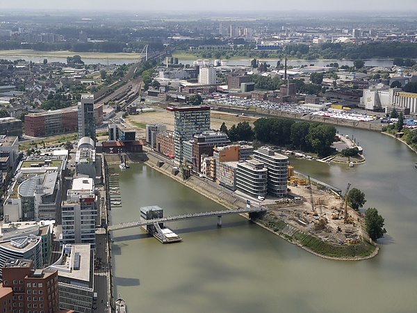 В 1982 году в гавани возводится телевизионная башня Rheinturm, несколько позже строятся здания «Западногерманского радио» и гавань получает название «Гавань средств массовой информации» (нем. Medienhafen. В 1990-х годах в гавани ведётся массовая застройка современными модернистскими зданиями. Особо выделяются здания «Новой таможни», построенные в 1996—1998 годах по проекту американского архитектора Фрэнка Гери.