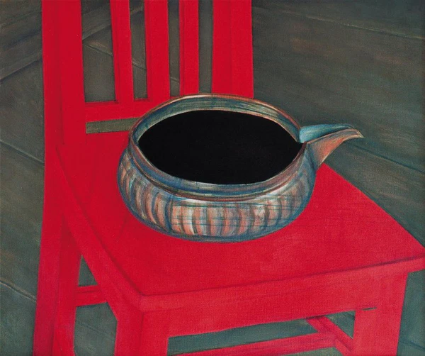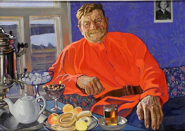 На полотне изображён пожилой мужчина в яркой красной рубахе, подпоясанной широким ремнём, и синих штанах. Он сидит, прислонившись к спинке дивана, правая рука согнута в локте и опирается на спинку, левая лежит на колене; правая кисть сжата в кулак. На лице мужчины заметна улыбка, взгляд устремлён на зрителя, волосы и усы имеют соломенный оттенок. Слева, на части стола, размещён поднос с самоваром, заварочным чайником, большой вазой с сахаром, меньшей вазой с конфетами, тарелкой с баранками, тремя яблоками, лимоном и стаканом чая на голубом блюдце. За спиной слева находится окно с видом наружу, справа — стена, украшенная яркими синими обоями с цветочным орнаментом, на которой размещён небольшой портрет молодой женщины.