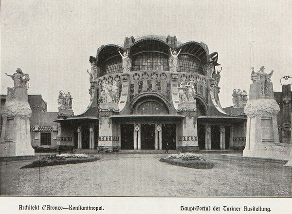 В 1900 году, поехав в Париж на Всемирную выставку, Д’Аронко познакомился с австрийцем Йозефом Марией Ольбрихом; в марте того же года в Вене, он смог увидеть современную архитектуру венской школы Отто Вагнера и войти в контакт с самыми передовыми кругами австрийской столицы. Находясь в Стамбуле, он также принимал участие в различных конкурсах, проводимых на родине. В 1902 году ему было поручено проектирование главного корпуса и одного из павильонов первой Международной выставки современного декоративного искусства (l’Esposizione internazionale d’arte decorativa moderna) в Турине. Постройка сооружений выставки сделала Раймондо Д’Аронко «заметной фигурой среди мастеров модерна»[5]. С 1900 года он стал самым востребованным архитектором высокопоставленных частных клиентов как османского, так и левантийского общества. Д’Аронко создал ряд новых резиденций по берегам Босфора и Мраморного моря, построил для министра внутренних дел турецкого правительства Мемдух-паши оригинальное здание, предназначенное для использования в качестве библиотеки. В Арнаут-Кёй архитектор устроил собственную резиденцию, в 1903 году он выполнил проект мечети в Галате.