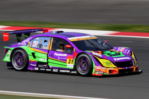 В апреле 2010 года было заявлено, что владельцы авторских прав на сериал выступят спонсором команды «apr» выступающей в классе GT300 в чемпионате Super GT, команда дебютировала в третьем заезде. Ранее эта команда, возглавляемая Хирото Канэсо, выигрывала гонку четыре раза. Как было заявлено, машина команды Toyota Corolla Axio должна была получить уникальный логотип «Eva Racing» и раскраску, повторяющую раскраску Евангелиона-01[27]. Позднее также был открыт набор частных спонсоров, которые в зависимости от взноса делились на «серебряных» (двенадцать тысяч иен), «золотых» (тридцать тысяч иен) и «чёрных» (пятьдесят тысяч иен). Сделавшим наибольший взнос «чёрным» вручались календари, а также фигурки пилотов Евангелионов 00 и 02, Рей Аянами и Сорью Аски Лэнгли, в форме «королев трассы». Помимо этого, сделавшие взнос получали возможность наблюдать за гонками, а также пропуск в паддок[28].