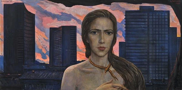 На полотне представлено погрудное изображение девушки с русыми волосами. На шее изображённое украшение — колье в виде змеи, что придаёт композиции символическое значение. Фоном служит городской пейзаж с многоэтажными домами.