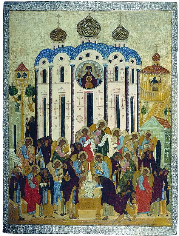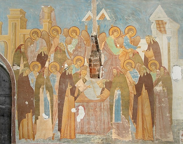 Наиболее известным изображением видения Евлогия является фреска Дионисия, созданная в 1502 году для собора Рождества Богородицы Ферапонтова монастыря. Фреска помещена рядом с жертвенником левого алтаря собора, что подчёркивает литургическое значение данного сюжета. Дионисий создал композиции из группы монахов без нимбов, стоящих в два яруса на условном архитектурном фоне, вокруг престола с золотым крестом, который окружён сиянием. Среди монахов помещены фигуры ангелов, раздающие им дары согласно видения Евлогия. Дионисий в своей фреске опустил все повествовательные подробности видения, даже не выделив среди монахов самого Евлогия и не изобразив различие в дарах, раздаваемых ангелами. Основным акцентом композиции он сделал литургическое единение церкви земной и небесной, что подчёркнуто светом от креста, лежащего на престоле, который символизирует фаворский свет, описанный в Евангелиях в момент Преображения Христова.