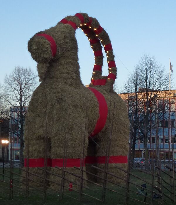 - 2014: К статуе было привлечено большое количество посетителей, чтобы помешать акту вандализма, и она осталась невредимой в четвёртый раз в истории. После Рождества козёл должен был быть представлен на праздновании нового года в Китае[2].