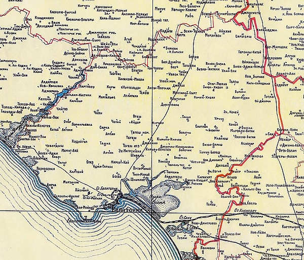 Занимал территорию современных Сакского, южную часть Раздольненского и юго-восточную Первомайского районов. На юге и юго-востоке граничил с Симферопольским округом (уездом), на востоке — с Джанкойским округом, на севере — с Бакальским и на западе с Ак-Мечетским районом. Точный состав пока не установлен, доступна только карта Крымского статистического управления 1922 года, где отмечены действовавшие границы[2].