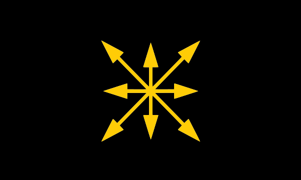 Применяются чёрные знамёна с расходящимися из общего центра золотыми стрелами, символизирующими в понимании сторонников организации максимальное расширение «евразийского пространства»[10]. Восьмиугольник стрел (роза ветров или «крестострел») на чёрном знамени и нарукавных повязках младоевразийцев олицетворяет собой золотую «Звезду Чингисхана в тёмном небе Евразии». Другие толкования — «звезда абсолютной экспансии»[11] и «Звезда Богородицы»[12]; похожий символ присутствует у писателя Майкла Муркока как «Знак хаоса».