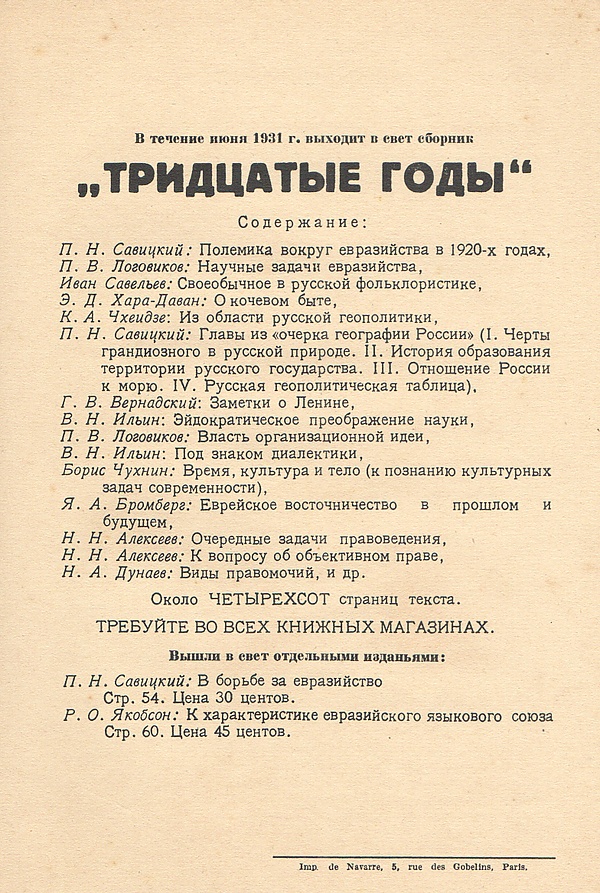 К евразийству примкнули многие видные эмигрантские учёные Г. В. Вернадский, Н. Н. Алексеев, Р. О. Якобсон, Л. П. Карсавин[2], В. Э. Сеземан, Д. П. Святополк-Мирский и др. С евразийцами сотрудничали П. М. Бицилли, А. В. Карташёв, Г. П. Федотов, Никон (Рклицкий), Э. Хара-Даван[8] и др.