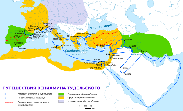 Примерно в 1168 году Византию посетил — с неизвестной целью, возможно из любви к путешествиям, возможно по другой причине[98] — путешественник из Наварры Вениамин Тудельский. О своём путешествии он составил заметки, являющиеся практически единственным источником сведений о количестве евреев, живших в разных городах империи. На своём пути через Византию путешественник из Туделы посетил, помимо крупнейших городов империи Фив, Фессалоник и Константинополя, ещё 23 населённых пункта[99]. Вениамин вступил на византийскую территорию на острове Корфу, где обнаружил одного еврея. Затем, после двухдневного перехода морем, он достиг некой «земли Левато» (которую исследователи идентифицируют либо с городом Амбракия в северной Греции, либо с островом Лефкас), где жили сто евреев. Далее он продолжил движение на юг через остров Итаку, Патры, Навпакт, Коринф, Фивы, Халкиду на острове Эвбея. В городке Синон-Потамо Вениамин обнаружил около 50 евреев, подвергавшихся грабительским набегам валахов. О последних он сообщает, что они «не строго соблюдают уставы христианской веры и называют друг друга еврейскими именами. Иные говорят даже, что они некогда были евреями и звали последних своими братьями». После этого Вениамин посетил несколько городов у Пагасетийского залива, затем он побывал в Фессалониках, откуда направился на север вдоль побережья Эгейского моря. Из расположенного на севере Греции города Драма Вениамин некоторое время двигался на юг по Эгнатиевой дороге до города Канистоли, вероятно соответствующего современному городу Кавала. Оттуда он морем добрался до Абиро, возможно, имея в виду малоазийский Абидос, и через 5 дней пути горами был в Константинополе. Сообщив подробные сведения о богатстве и великолепии византийской столицы, Вениамин сообщает, что собственно в Константинополе евреев нет, поскольку живут они по другую сторону пролива в Пере. Остаток своего пути по империи Вениамин проделал морем. По Мраморному морю он достиг Родосто, где еврейская община насчитывала 400 человек, затем Галлиполи. Посетив ещё несколько островов в Эгейском и Средиземном морях, везде обнаруживая значительное число евреев, Вениамин Тудельский покинул территорию Византии[100].