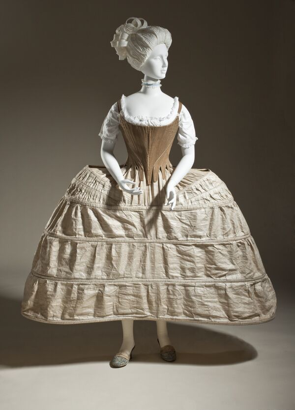 На каркас надевались несколько дополнительных юбок, в том числе та, которая будет видна из-под распашного платья (англ. petticoat), и собственно само платье.