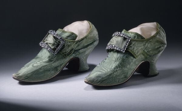 Фасон туфель мало изменялся до эпохи ампира; наиболее распространённым были остроносые туфли с «язычком», на изогнутом каблуке, именуемом «голубиная лапа». Такой каблук был вогнут внутрь и визуально уменьшал расстояние между носком и пяткой, что позволяло женской ножке казаться меньше. В отличие от мужской обуви, преимущественно тёмной, женская отличалась пестротой и обилием отделки, гармонирующей с платьем. До XIX века обувь на обе ноги изготавливалась одинаковой и не имела разделения на правую и левую.