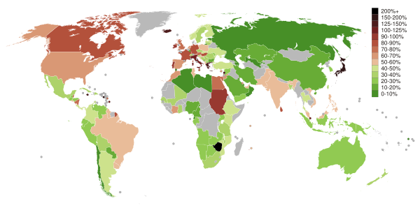 Согласно данным Банка международных расчётов, между 1980 г. и 2010 г. суммарная величина частного и государственного долга 18 стран ОЭСР выросла почти в четыре раза и, скорее всего, будет продолжать расти, к 2040 г. составив от 250 % (Италия) до около 600 % (Япония)[272]. По данным предыдущего исследования тех же авторов, увеличение финансового бремени, вызванное старением населения и снижением темпов экономического роста, делает решение проблемы госдолга в странах с его значительной величиной маловероятным в случае соблюдения хотя бы одного из следующих трёх условий[273]: