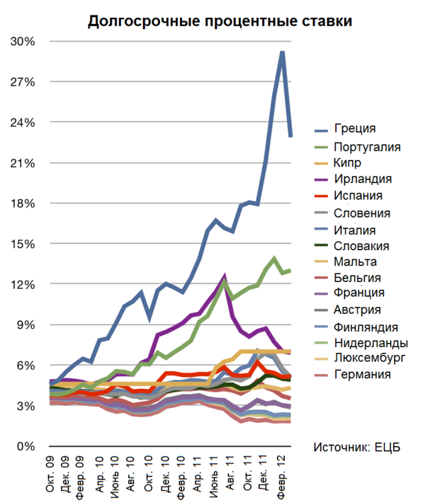 В сентябре 2011 г. после понижения рейтинга государственных облигаций Кипра всеми крупными рейтинговыми агентствами, вызванного разрушительным взрывом на электростанции в июле и недостаточно быстрым проведением бюджетно-финансовой и структурной реформ, уровень доходности долгосрочных гособлигаций этого небольшого острова с населением 840 тыс. человек поднялся выше 12 %. Начиная с января 2012 г., дефицит бюджета и рефинансирование срочных долговых обязательств Кипра осуществляется на средства, полученные по экстренному кредиту в €2,5 миллиарда, выданному Россией. Процентная ставка по кредиту составляет 4,5 %, его срок — 4,5 г.[122], хотя и ожидается, что Кипр сможет самостоятельно финансировать свои расходы к первому кварталу 2013 г.[123]. 12 июня 2012 г. в репортажах в финансовых СМИ утверждалось, что вскоре правительство Кипра вновь обратится за финансовой помощью. Несмотря на то, что население страны и масштабы её экономики невелики, оффшорная банковская отрасль Кипра является значительной по величине[124]. 25 июня 2012 г. правительство Кипра обратилось за финансовой помощью из ЕФФС или Европейского стабилизационного механизма. Ожидается, что в соглашение о предоставлении финансовой помощи будут включены условия о проведении налогово-бюджетной реформы. Обращению за экстренной помощью предшествовало понижение кредитного рейтинга гособлигаций Кипра до BB+ агентством «Фитч», которое произошло также 25 июня 2012 г. Из-за этого государственные облигации Кипра не могут быть приняты ЕЦБ в качестве обеспечения[125].
