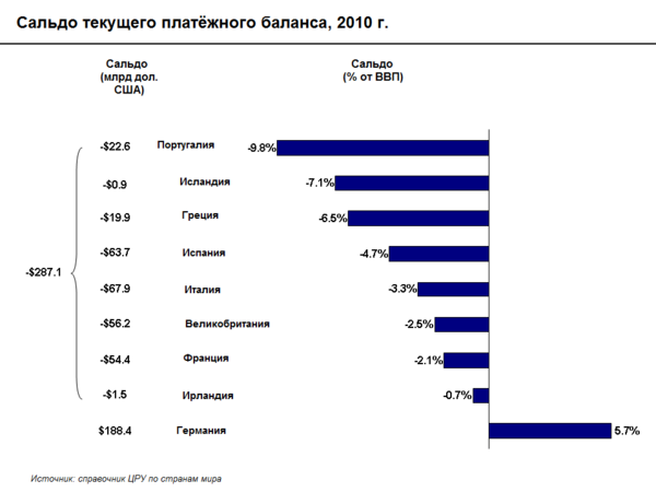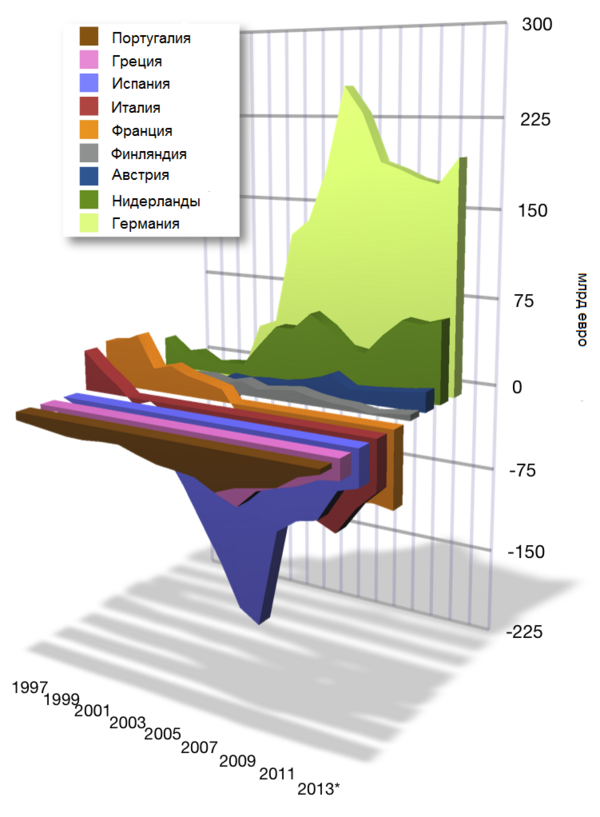 В 2009 г. дефициты торгового баланса Италии, Испании, Греции и Португалии оценивались в $42,96 млрд, $75,3 млрд, $35,97 млрд и $25,6 млрд соответственно, в то время как профицит торгового баланса Германии составлял $188,6 млрд[256]. Аналогичное нарушение равновесия торгового баланса наблюдается в США, где из-за значительного дефицита торгового баланса необходимо привлечение иностранных заёмных средств. В 2005 г. Бен Бернанке предупреждал об опасности «избытка сбережений» в какой-либо стране: по его мнению, профицит торгового баланса одной страны может привести к потоку капитала в страны с дефицитом торгового баланса, что приведёт к искусственному занижению процентных ставок по кредитам и возникновению пузырей на рынках активов[257][258][259].