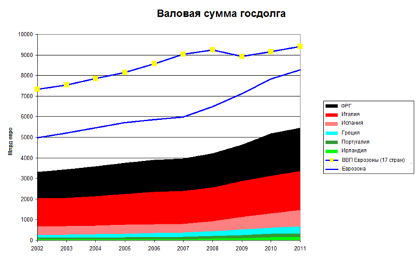 В то время как объёмы выпуска государственных облигаций существенно возросли лишь в нескольких странах еврозоны, рост государственной задолженности стал восприниматься как общая проблема всех стран евросоюза в целом[19]. Тем не менее, европейская валюта остаётся стабильной[20][21]. На три страны, в наибольшей степени затронутых кризисом (Греция, Ирландия и Португалия), приходится 6 процентов валового внутреннего продукта (ВВП) еврозоны[22].