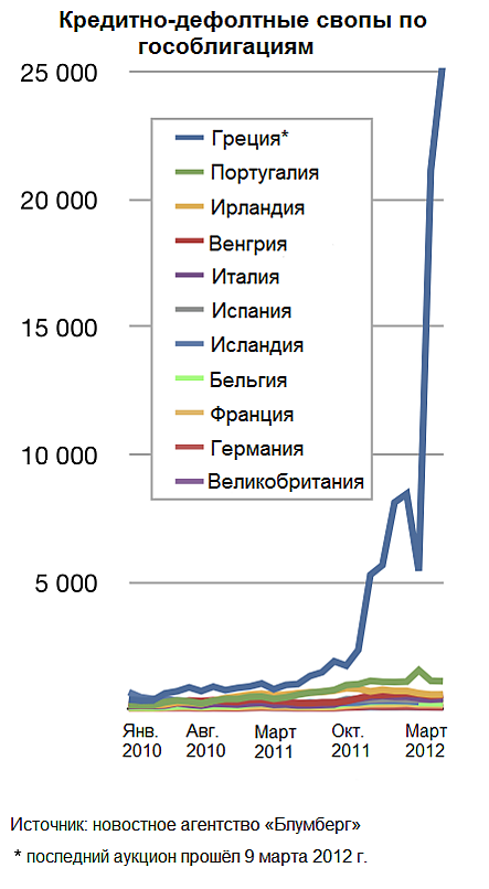 С началом кризиса стало очевидным, что облигации Греции и, возможно, других стран являются более рискованными инвестициями, чем ранее предполагалось. Помимо отсутствия информации о величине риска дефолта по европейским гособлигациям, развитию кризиса способствовал конфликт интересов банков, занимавшихся оценкой вероятности погашения кредитов. Как правило, потеря доверия к государственным облигациям приводит к росту стоимости кредитно-дефолтных свопов, отражая представление участников рынка о кредитоспособности стран (см. диаграмму)[61].