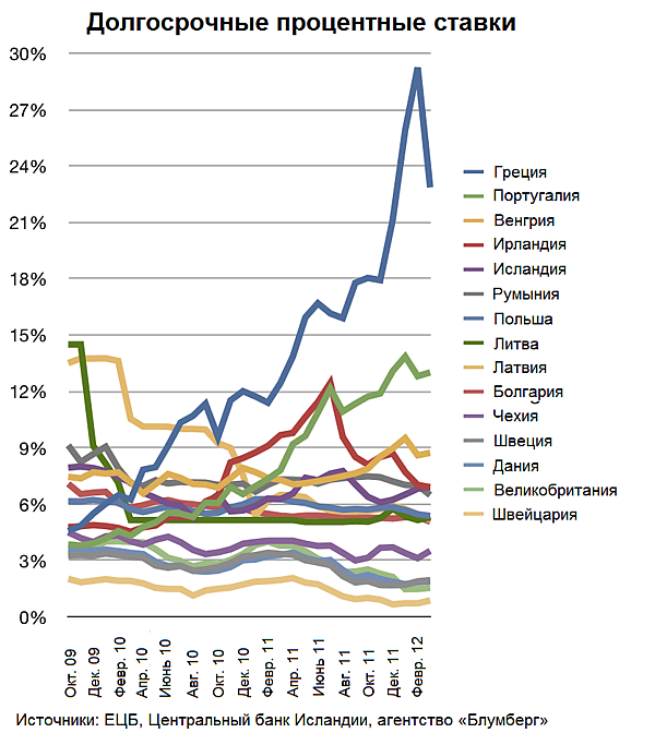 В первые несколько недель 2010 г. инвесторы вновь были обеспокоены величиной государственного долга европейских стран, что привело к дальнейшему повышению процентных ставок по государственным облигациям стран с наиболее высокими уровнями госдолга, бюджетного дефицита и дефицита текущего платёжного баланса. Это привело к тому, что привлечение средств для дальнейшего финансирования бюджетного дефицита и осуществления выплат по существующим задолженностям стало затруднительным для ряда стран, в случае низких темпов экономического роста и в тех случаях, когда значительная часть государственных облигаций находилась в руках иностранных кредиторов, как в Греции и Португалии[68].